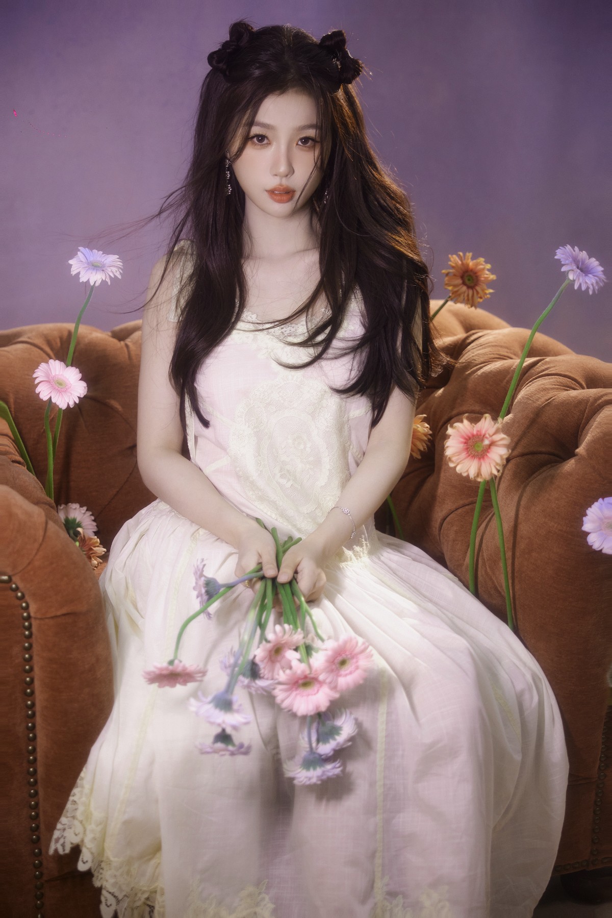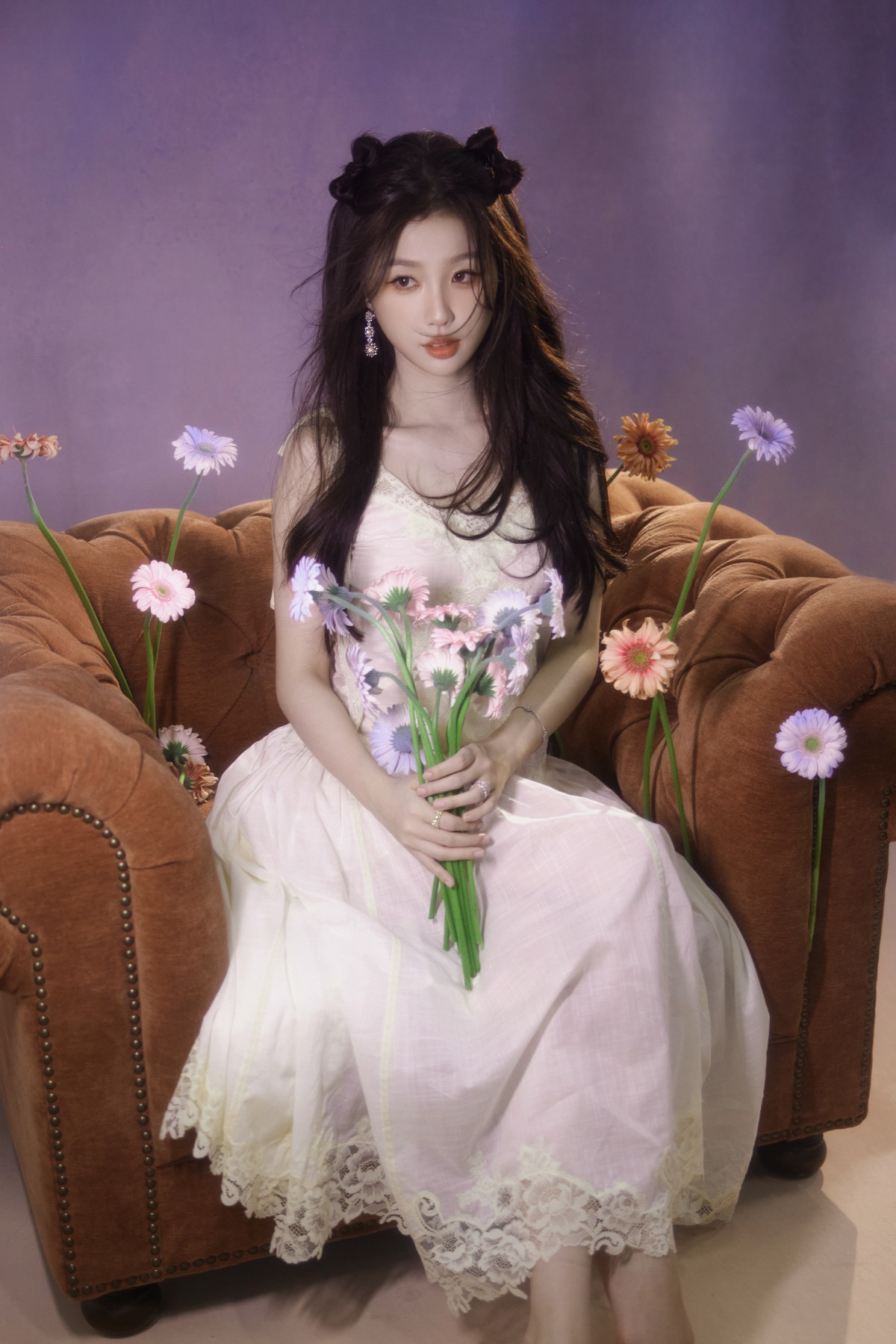 浅粉色蕾丝裙是整个造型的“浪漫载体”。吊带设计露出修长的天鹅颈,蕾丝花纹如春日藤蔓般蜿蜒攀爬,将少女的柔美藏在每一处褶皱里。裙摆的层叠与蕾丝边,即便在静态画面中,也能让人联想到走动时的轻盈摇曳。面料的清透感与妆容的柔和、发型的飘逸形成呼应,仿佛把“春日浪漫”熬成了具象的汤,每一口都带着花的香、云的逸。